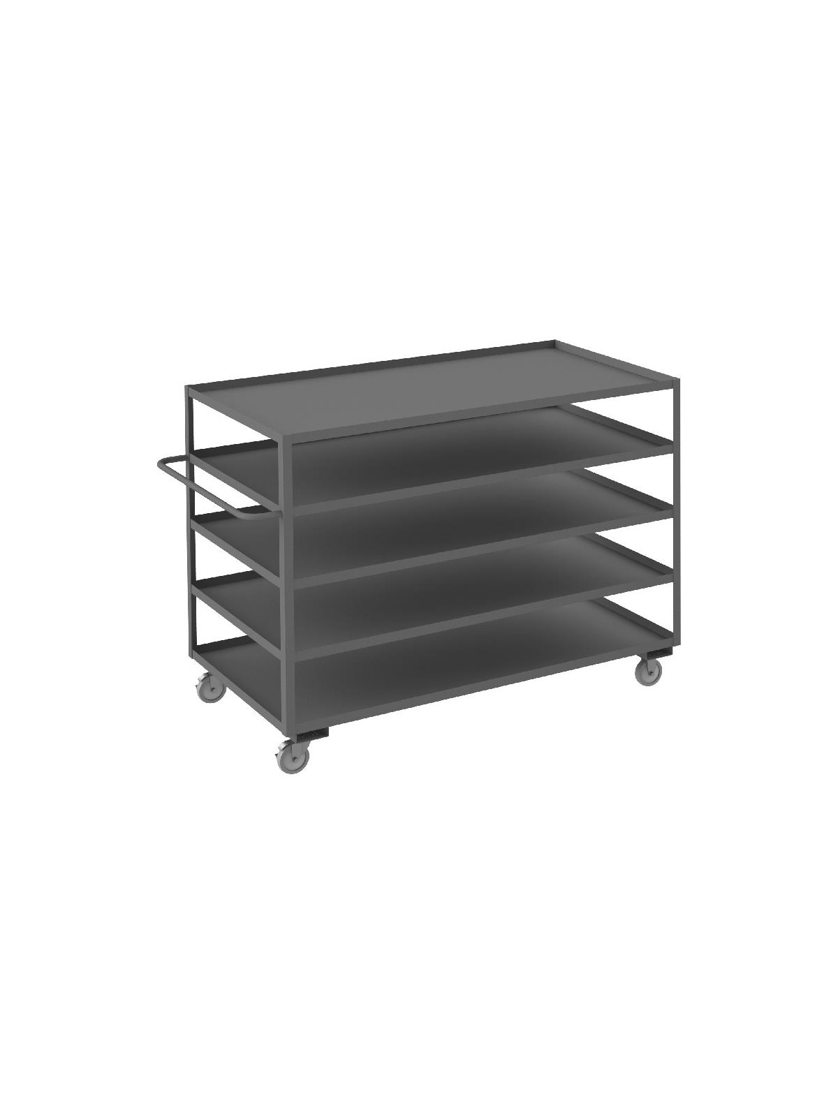Shelf carts are constructed with 1-1/2" x 1/8" angle iron uprights for added strength. Heavy duty 14 gauge steel shelves. Sturdy tubular push handle. Perfect for transporting heavier parts or stock items. Shelf Stock Carts are available in 1,200 lbs. or 3,000 lbs. capacities. FOB Shipping Point.