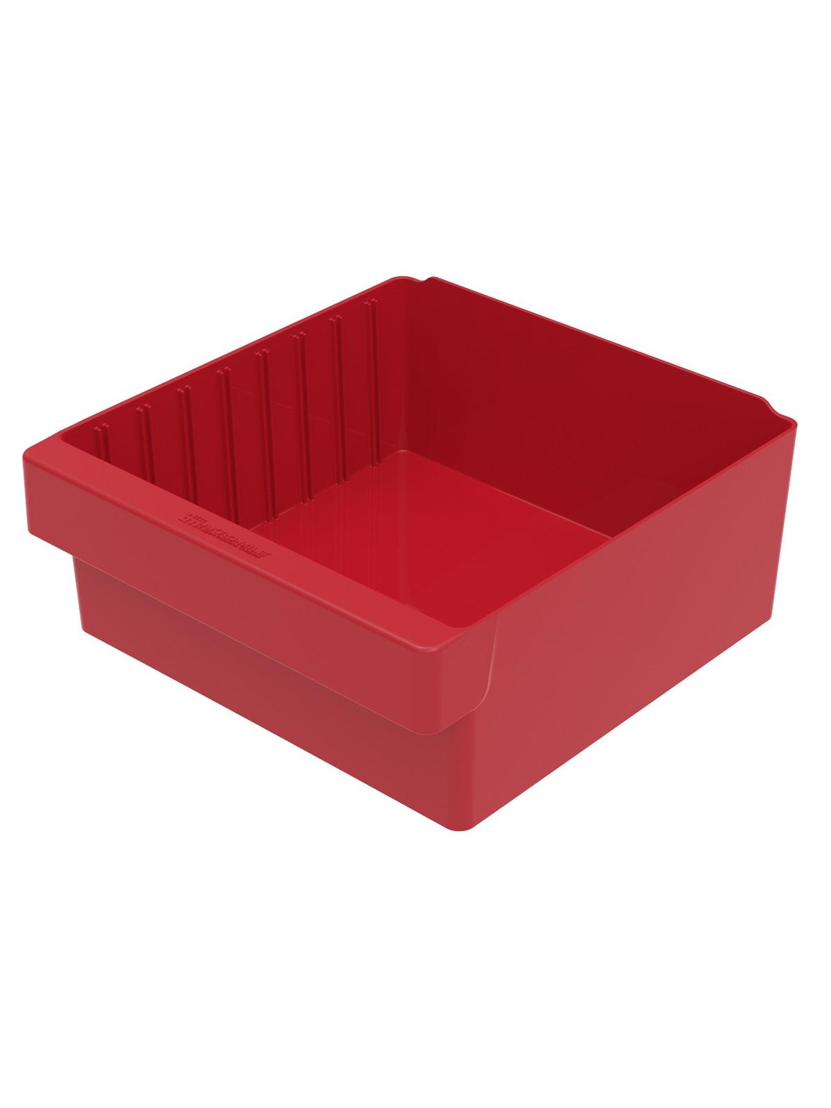 Offered in 12" or 18" depths to work with compatible shelving. Easy to label and color code inventory for quick identification of parts and supplies. Drawers can be stacked to optimize space. Wide front handle for easy gripping when AkroDrawers are loaded or contain heavy contents. Can be used with available shelving, racks, mobile carts or can be used by themselves. Sturdy back stop tab ensures AkroDrawers can hang securely from shelves. Dividers are available to keep contents neatly separated in drawers. Available in Blue, Gray, Yellow, Red and Clear - Minimum order required. FOB Shipping Point.