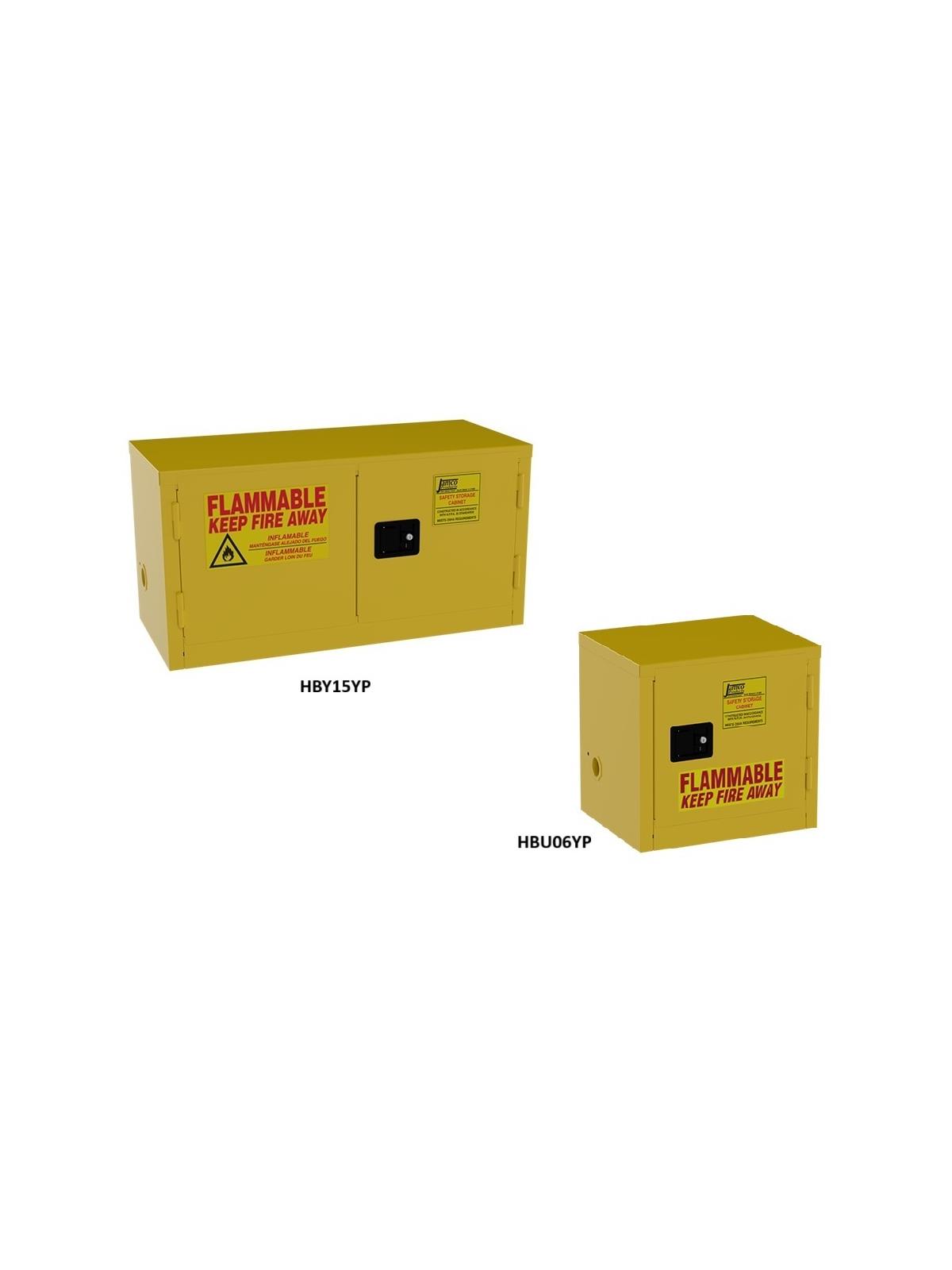 Store flammable items on counter or stacked on other cabinets. Lockable flush mounted handle with 2 keys. Adjustable leveling feet. Powder-coated yellow finish with grounding connector. Optional shelf available (cabinet can only hold one). FOB Shipping Point.