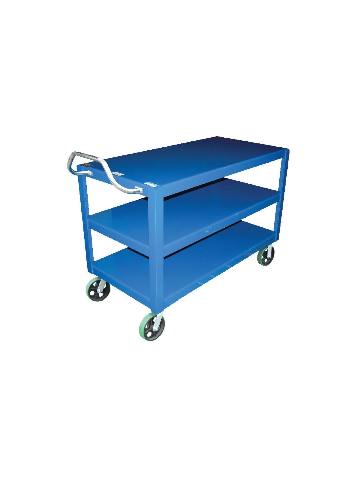 Constructed of heavy-duty steel to handle uniform loads up to 4,000 pounds. The patented ergonomic handle decreases fatigue by allowing the operator to easily maneuver the cart. Handle can be inverted for individual height comfort. Rolls on 8" x 2" casters, two (2) rigid and two (2) swivel with roller bearings. Many caster styles to choose from. Additional sizes available.  FOB Shipping Point.