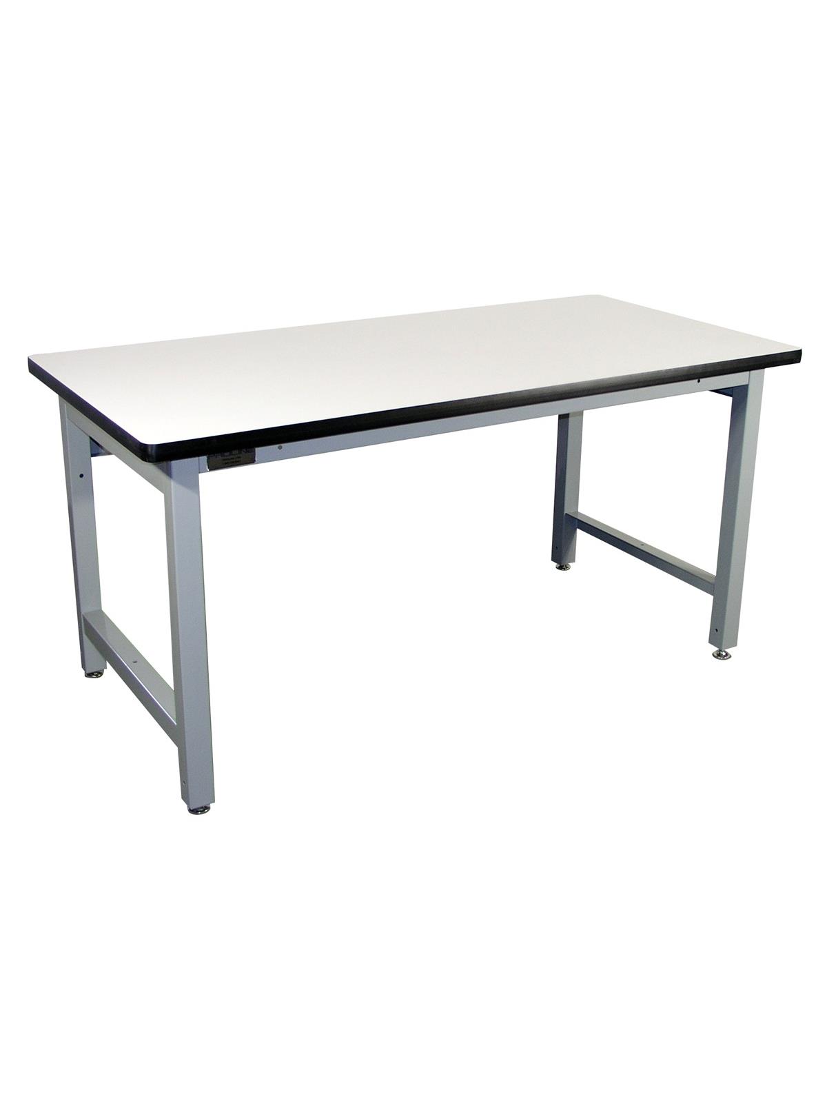 Handsome work station provides efficient pull-pin height adjustment. Industrial grade features include 16 ga. 2" square legs, 2" thick front and 8" thick back rails. Safely handles 1000 lb capacity loads.