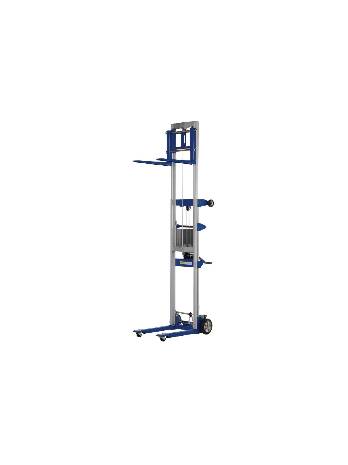 Operated by a hand-crank winch that features a reversible handle and a hold-down device for securing the carriage during transport. Forks can be inverted to provide 2 different heights. Rugged thick steel forks are 4"W x 1-3/4" thick and forks measure 20-1/2"W x 22"L overall. Truck is made of durable steel-and-aluminum. Two 8" non-marking rear wheels, two 2" front swivel casters. Counter balanced design has poly-on-poly wheels, (2) 5" rear swivel wheels, (2) 4" front wheels. Models ending with 'HP' and 'EHP' suffixes have extended height capabilities. These units have a 2 stage mast system and a telescoping inner mast frame, giving the user the ability to extend the forks above the height of the first mast. FOB Shipping Point.